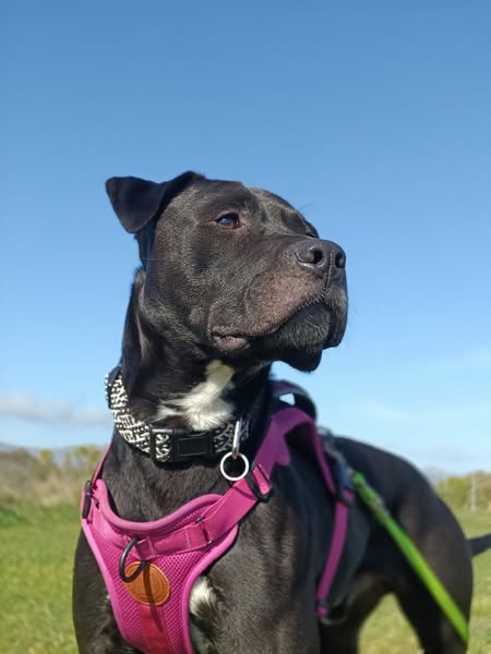 Humphrey is a handsome Staffy cross, around five years old and a solid 28.6kg of charm. Recently rescued from the Christchurch City Animal Shelter, he’s new to our care but already showing us he’s a friendly boy who enjoys company and will shine with the right introductions.