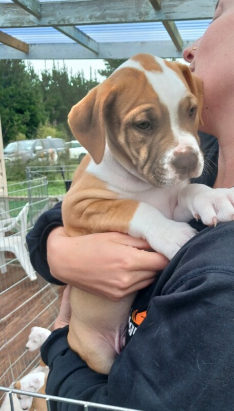 At just 6 weeks old, the Ruby litter are already showing their sweet personalities. There are 10 puppies in total – 6 females and 4 males. We believe these pups are Staffy x sharpei, and are expected to grow into medium sized dogs, around 25–28kg once fully grown.