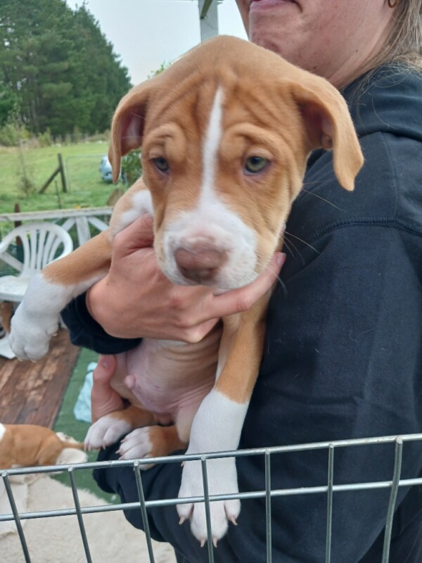 At just 6 weeks old, the Ruby litter are already showing their sweet personalities. There are 10 puppies in total – 6 females and 4 males. We believe these pups are Staffy x sharpei, and are expected to grow into medium sized dogs, around 25–28kg once fully grown.